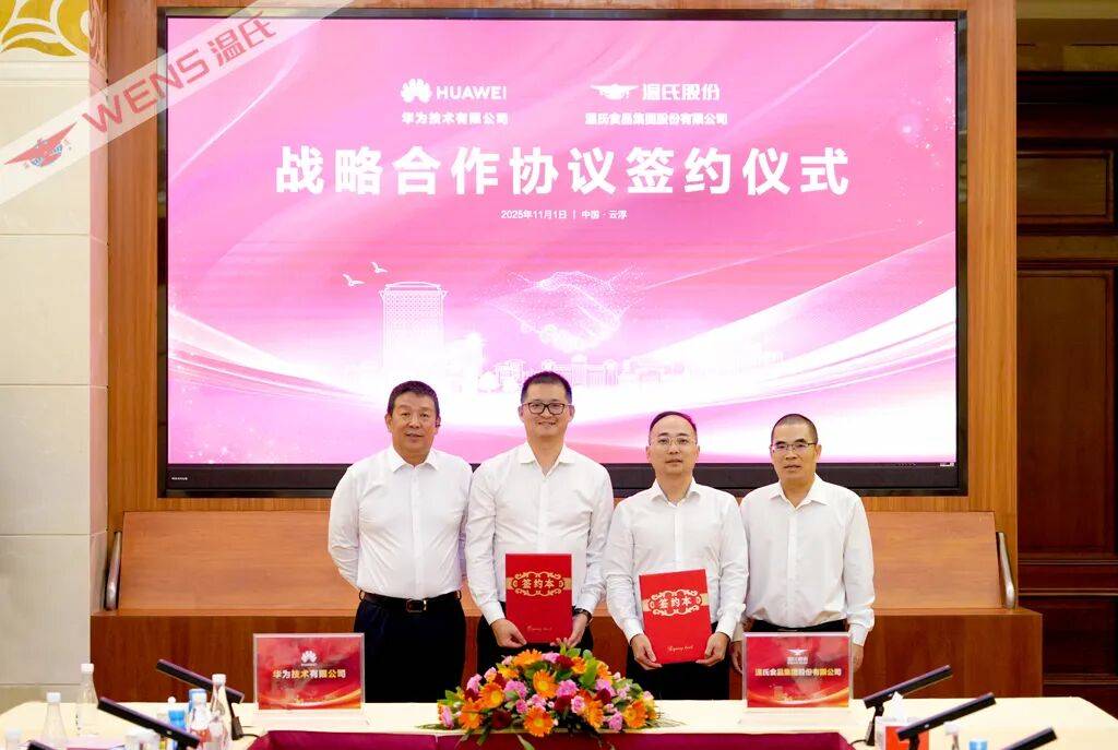 温氏股份总裁黎少松取华为云广东云营业部部长张英梗代表两边签订和谈,